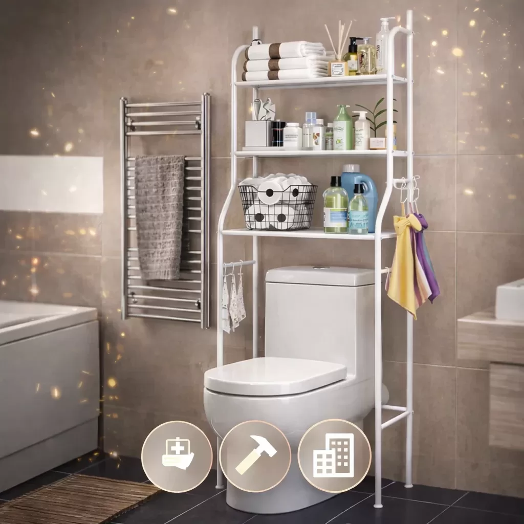 Kompakts trīsstāvu plaukts palīdz izmantot telpu virs sanitārtehnikas un kārtīgi uzglabāt visu nepieciešamo vannā un tualetē.